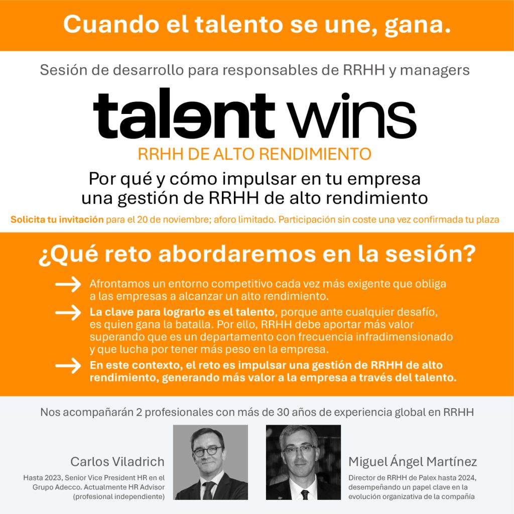 Solicita tu invitación gratuita para la próxima sesión de desarrollo para responsables de RRHH y managers "𝘁𝗮𝗹𝗲𝗻𝘁 wins: RRHH de alto rendimiento" del próximo día 20 de noviembre en Barcelona.