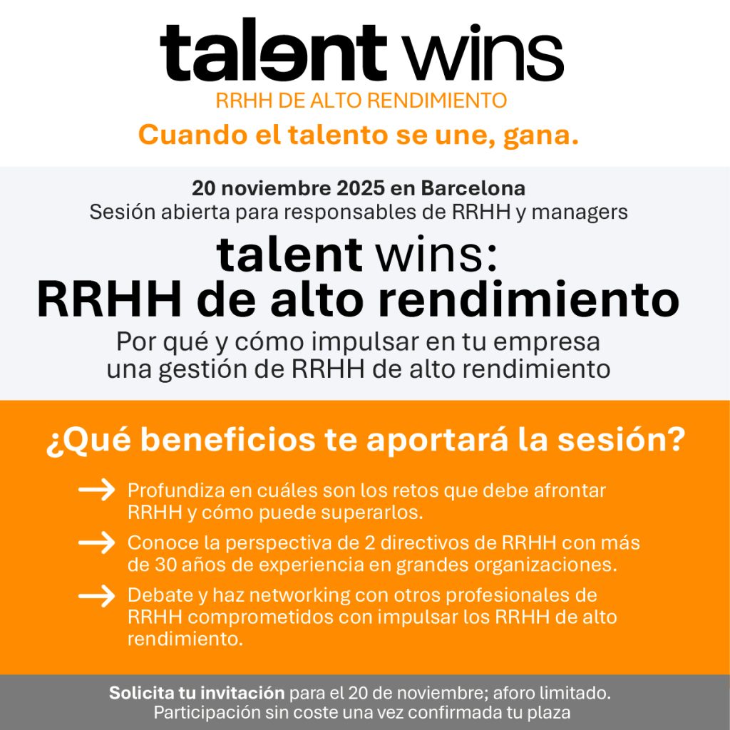 Solicita tu invitación gratuita para la próxima sesión de desarrollo para responsables de RRHH y managers "𝘁𝗮𝗹𝗲𝗻𝘁 wins: RRHH de alto rendimiento" del próximo día 20 de noviembre en Barcelona.